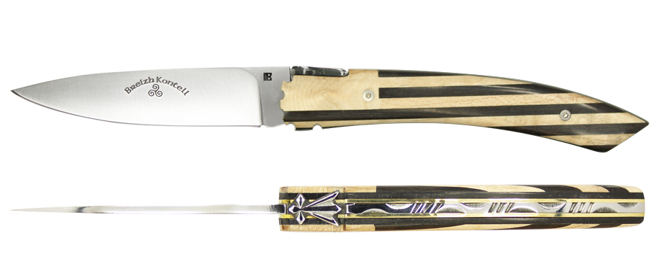 Le Breizh Kontell (couteau breton) se revêt du Gwen ha Du en hommage à la Bretagne qui l'a vu naitre il y a plus de 20 ans.