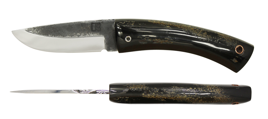 Une lame en acier carbone entièrement façonnée, polie et ciselée à la main ; un traitement brut de forge et une trempe sélective.