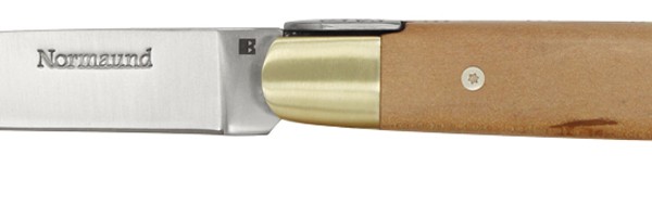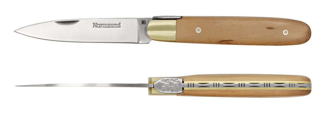 Le manche est réalisé en bois de pommier et la mouche reprend les deux léopards, symbole de la région normande.