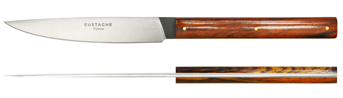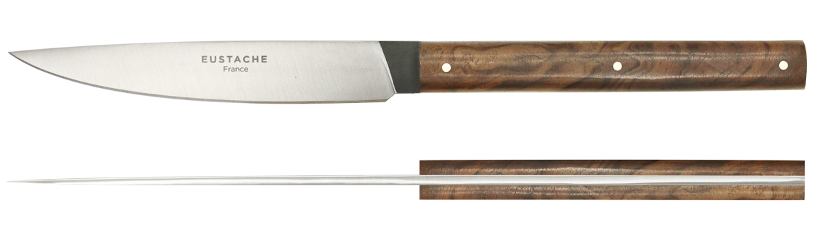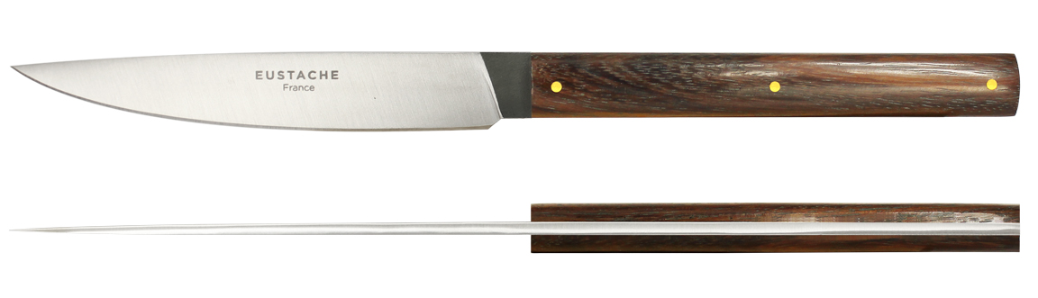 L'Épicure N°1 possède une lame satinée et est proposé en différents bois polis à la main ou micarta.