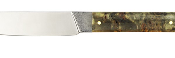 Des matériaux nobles sont utilisés dans la conception du manche, tels que la Loupe de noyer stabilisée, le Bois de Fer, l'Hêtre debout ou le Chameau teinté.
