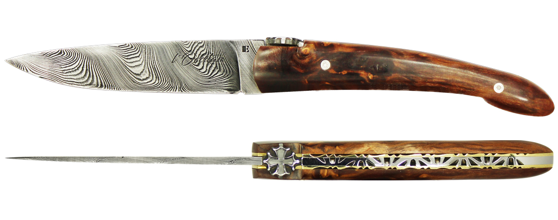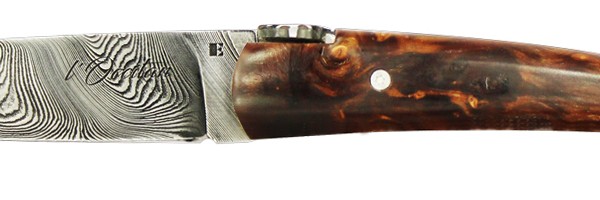 La lame est en acier Damas issu de la métallurgie des poudres. Il est produit à partir de deux aciers durcissables de couleurs différentes (RWL34 et PMC27).