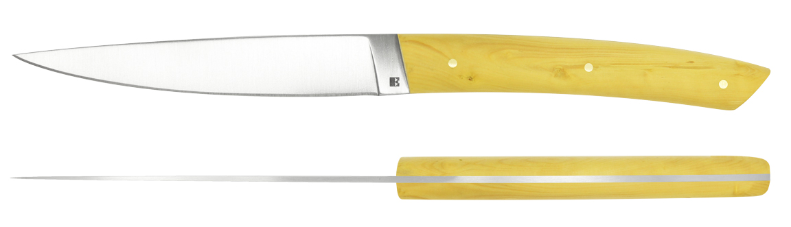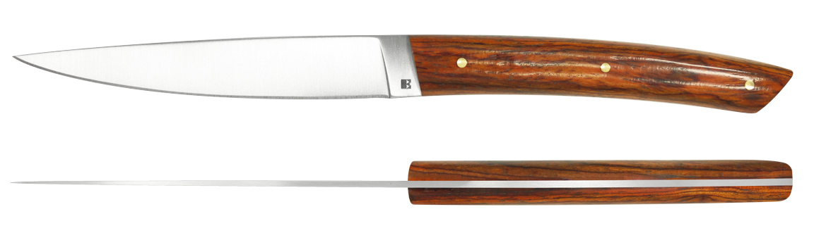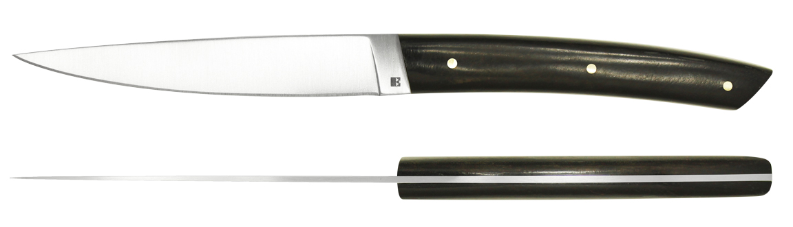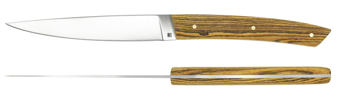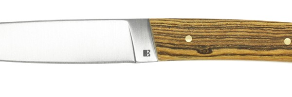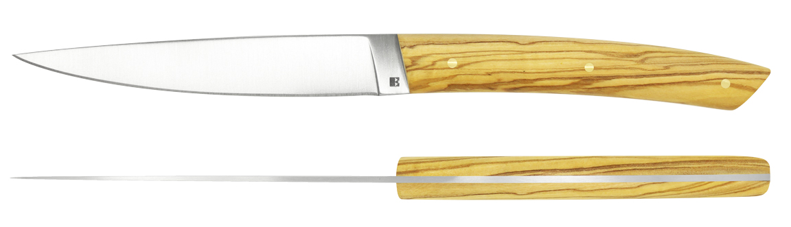 La finition satinée se marie admirablement avec une collection de manches en bois façonnés et polis à la main par nos artisans couteliers.